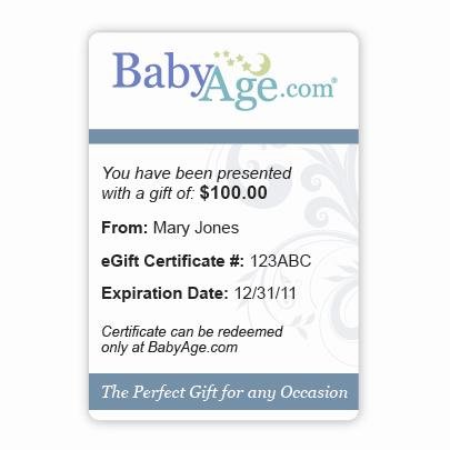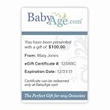 Gift Certificate for 100 - Gift Certificate for 100: What a Great Gift for Any Parent! Whether it's for a Baby Shower, their new arrival or a "Just Because" gift, this will brighten any parents day. They can shop in the convenience of thier own home at BabyAge.com and have their items delivered right to their door. With the biggest selection of Baby Strollers, Baby Bedding, Car Seats and more, they will understand why moms and dads choose BabyAge.com first for all their baby needs.See Details >>This is The Best Selling Gift Certificate for 100 tends to SELL OUT VERY FAST!!